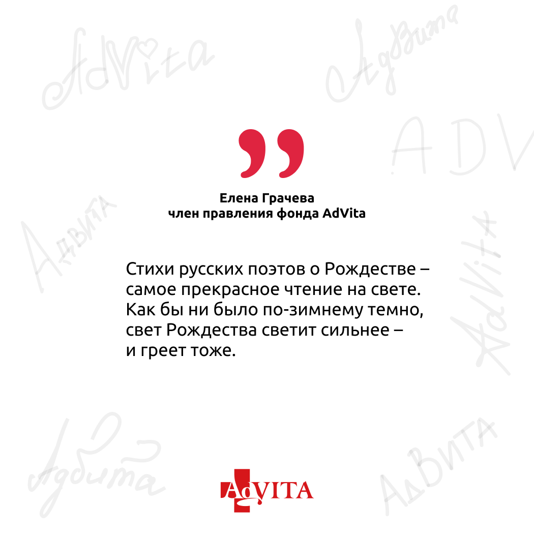24 декабря в 19:00 мы собираемся на онлайн-вечер читать и слушать рождественские стихи – и собираем пожертвования для тех, кто встречает Рождество в больнице. В гости придут наши друзья – поэты и филологи Игорь Булатовский, Иван Давыдов, Валерий Дымшиц, Всеволод Зельченко, Ольга Кушлина, Роман Лейбов, Дарья Мезенцева, Вячеслав Попов, Георгий Стариковский, Василий Степанов, Мария Степанова и другие чудесные люди, которые хотят помочь фонду AdVita собрать пожертвования. Поверьте, вы этого никогда не забудете.